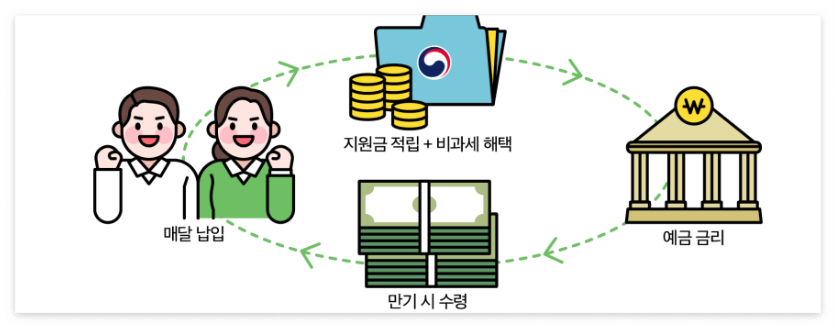 청년의 중장기 자산형성 지원을 위한 정책형 금융상품으로, 만기 5년(60개월) 동안 매월 70만 원 한도 내에서 자유롭게 납입하면 매월 최대 6%의 정부지원금을 지급하고 이자소득에 대한 비과세 혜택을 제공하는 상품입니다.