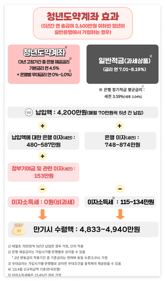 청년의 목돈 마련을 위한 청년도약계좌가 금일(6/15) 운영이 개시되었습니다. 청년도약계좌는 5년 동안 매달 70만 원씩 모으면 정부가 월 최대 24,000원 지원, 이자소득에 대해선 비과세혜택을 준다고 합니다. 청년들의 중장기적 자산형성을 지원하기 위해 추진된 청년도약계좌에 대해 자세히 알려드릴 테니 확인하셔서 꼭! 좋은 기회 놓치지 마시기 바랍니다.