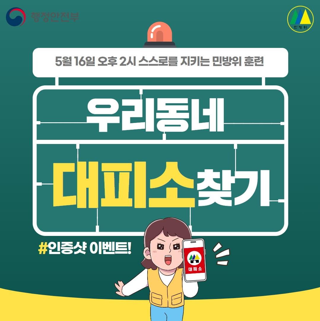● 행정안정부는 민방위훈련에 대한 국민의 관심과 공감을 확산시키기 위해 4월 17일(월) 부터 5월 16일(화)까지 "내 주변 대피소 찾기" 온라인 행사를 실시하고 있습니다.
