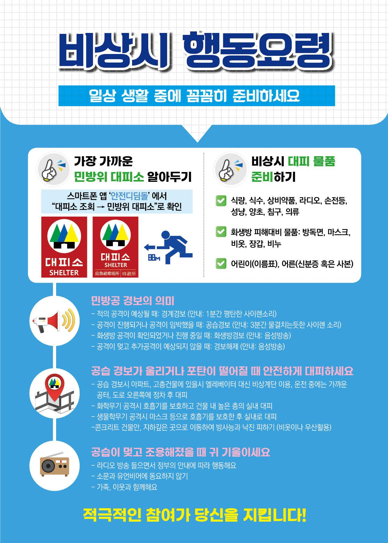 ● 경보는 실제상황이 아닌 훈련상황이므로 당황하지 마시고, 가까운 민방위 대피시설로 대피하시기 바랍니다.